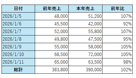 - 「なぜ?」を考えるきっかけに: 「10日(土)は去年よりグンと伸びたけれど、何が売れたんだっけ?」と振り返ることで、次の仕入れのヒントが見つかります。