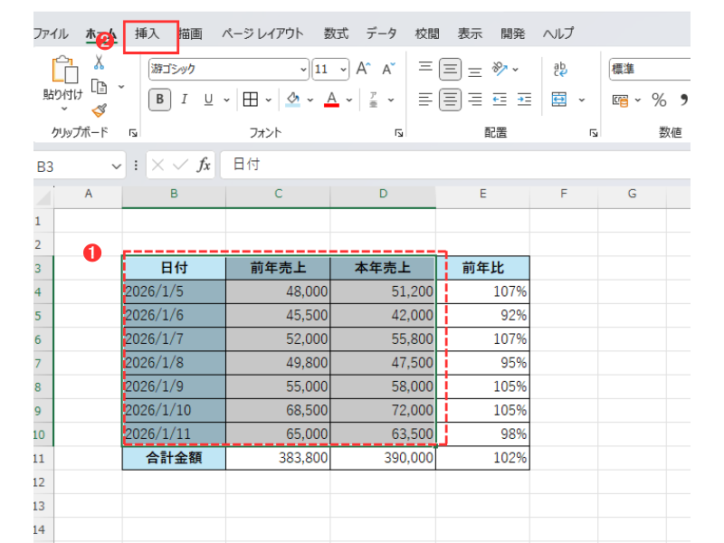 まずは、先ほどご紹介した「日付・前年売上・本年度の売上」の表を準備します。